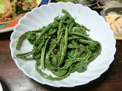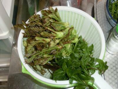 連休に家族三人(妻・次女・四女)が山荘に来て早朝にコゴミを採りに