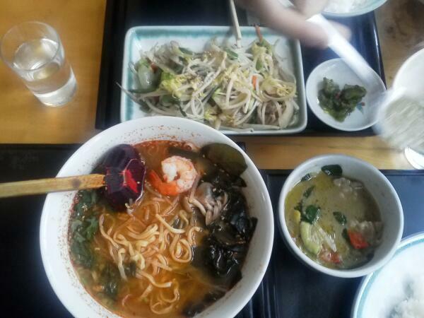 宿場の湯で娘二人とタイ料理トムヤンクンラーメン・グリーンカレー等